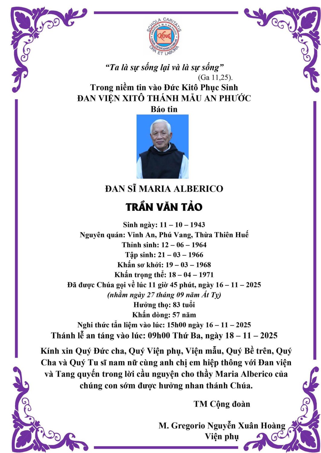 Cáo phó Đan sĩ M. Alberico Trần Văn Tảo (1943-2025)